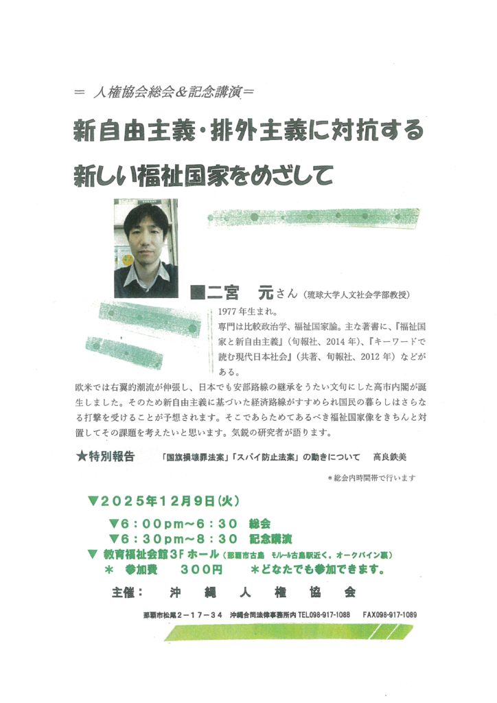 沖縄人権協会の総会後に下記のとおり記念講演を開催いたします。 琉球大学人文社会学部教授二宮元氏による講演「新自由主義・排外主義に対抗する新しい福祉国家をめざして」は、昨今の右翼的潮流のなか、その背景とあるべき福祉国家像からその課題を考えていきます。どなたでもご参加可能ですので、ぜひご参加ください。