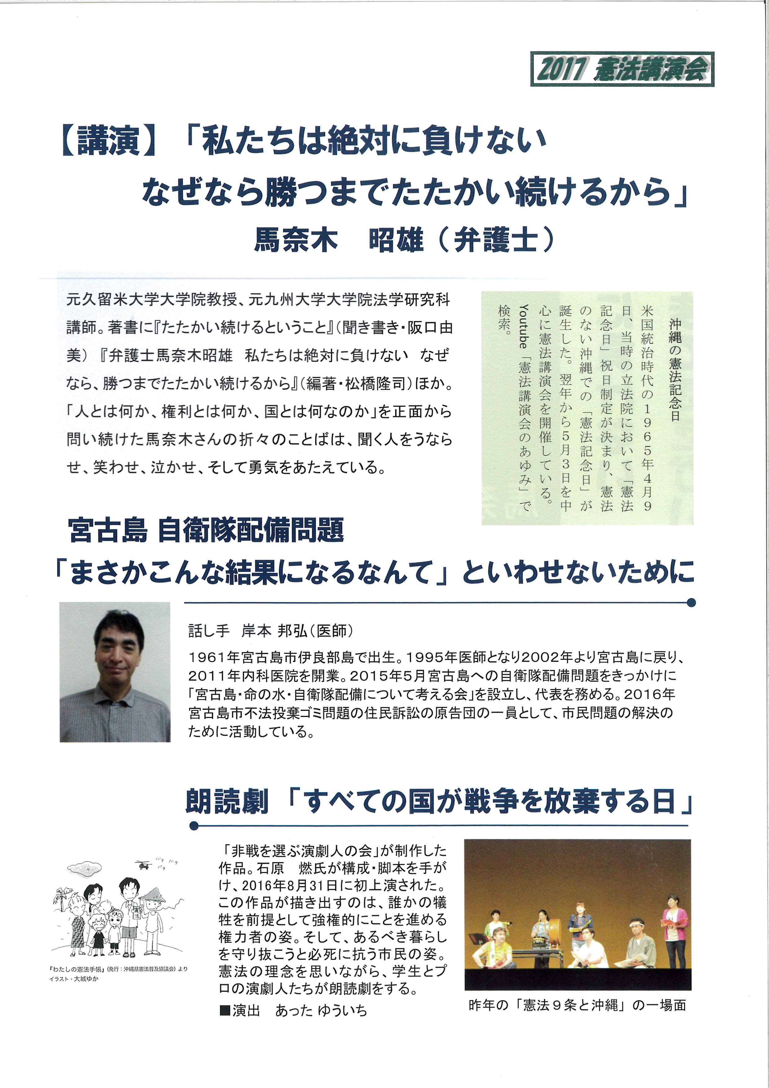 問い合わせ先:電話098-854-3381 または 098-917-1088 (沖縄県憲法普及協議会)