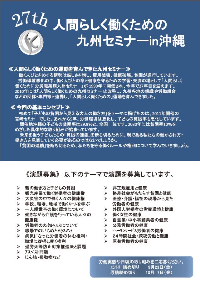 2016年11月12日~13日に、「第27回人間らしく働くための九州セミナーin沖縄」が開催されます。
